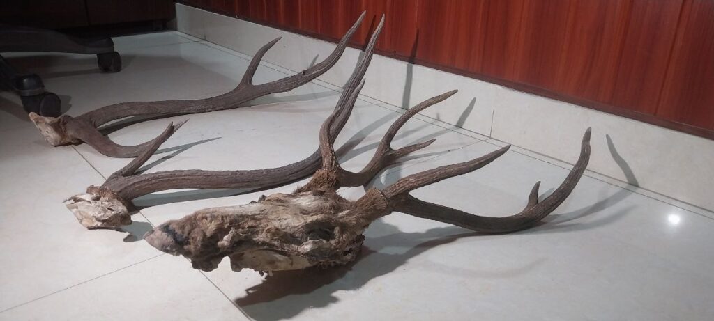 दिनेश यदु @ Raipur : मोवा क्षेत्र में वन विभाग की टीम ने एक बड़ी कार्रवाई करते हुए दो शिकारी आरोपियों को हिरण के सिंग के साथ गिरफ्तार किया है। यह छापेमारी तब हुई जब वन विभाग को गश्त के दौरान एक सटीक सूचना मिली और तुरंत कार्रवाई की गई। वन विभाग ने मोवा क्षेत्र में दो शिकारी आरोपियों, काजी अब्दुल यासिर और काजी मोहम्मद फरहान, को हिरण के सिंग के साथ गिरफ्तार किया। आरोपियों ने हिरण के सिंग को सफेद बोरी में छुपाकर रखा था, जो छापेमारी के दौरान बरामद किया गया। इसके साथ ही वन विभाग ने हिरण का मांस, खाल, खोपड़ी और एक वाहन भी जब्त किया, जिससे यह पुष्टि हुई कि शिकार एक चीतल (हिरण) का था, जो कि पूर्ण रूप से प्रतिबंधित है।