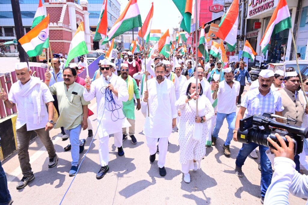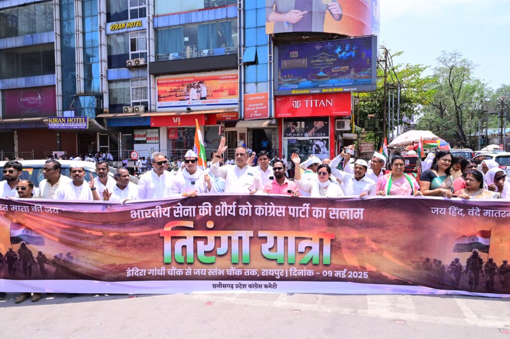 रायपुर @ जम्मू-कश्मीर के पहलगाम में हुए आतंकी हमले के विरोध और देश के वीर जवानों को श्रद्धांजलि देने के लिए राजधानी रायपुर सहित पूरे देश में ‘‘जय हिंद तिरंगा यात्रा’’ निकाली गई। अखिल भारतीय कांग्रेस कमेटी के आव्हान पर निकाली गई इस यात्रा में राजधानी रायपुर में पूर्व विधायक विकास उपाध्याय के नेतृत्व में बड़ी संख्या में कांग्रेसजनों ने हिस्सा लिया।